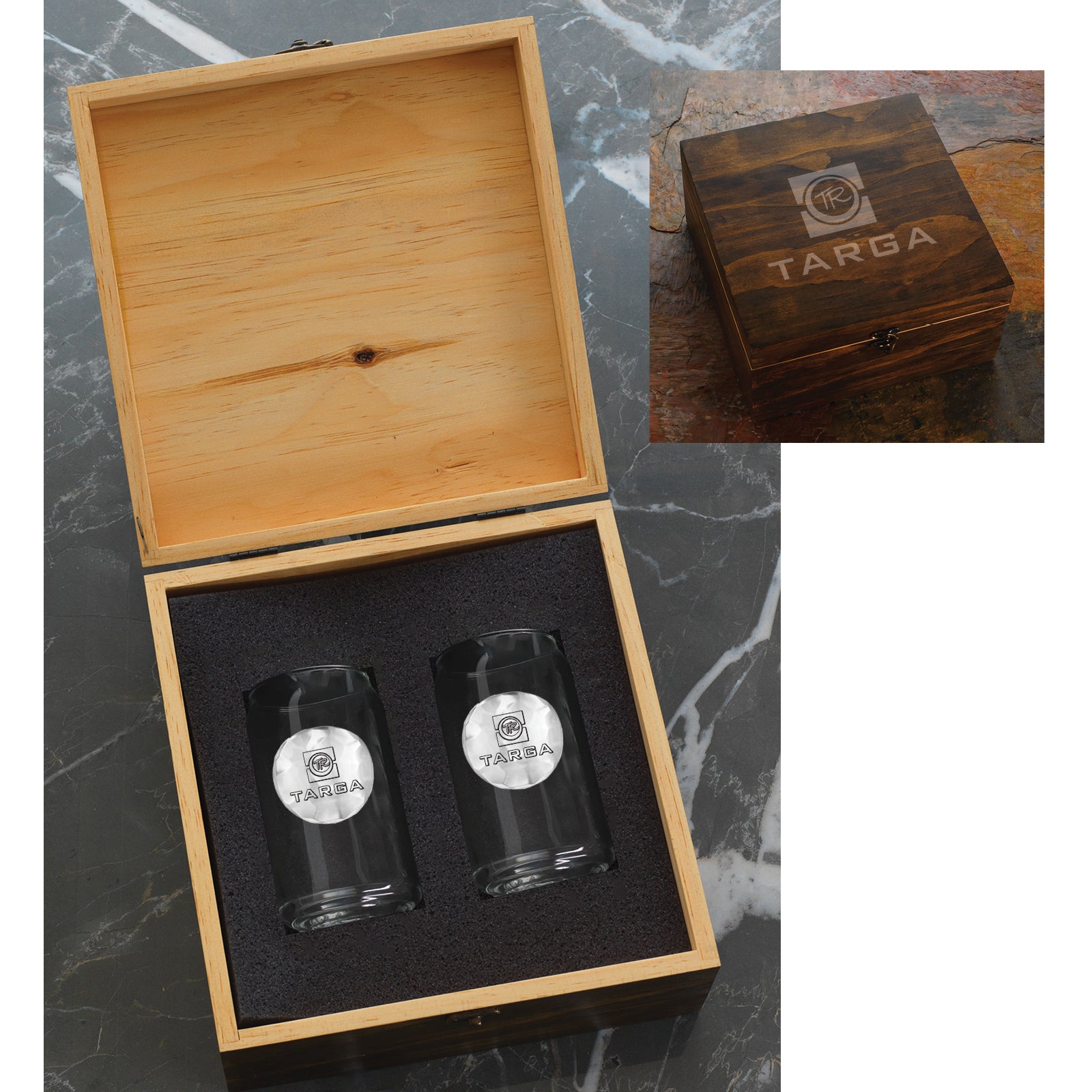 Manhattan sets are packaged in a pine gift box (9 ¾” x 10” x 5 ¼”). View additional packaging options here.