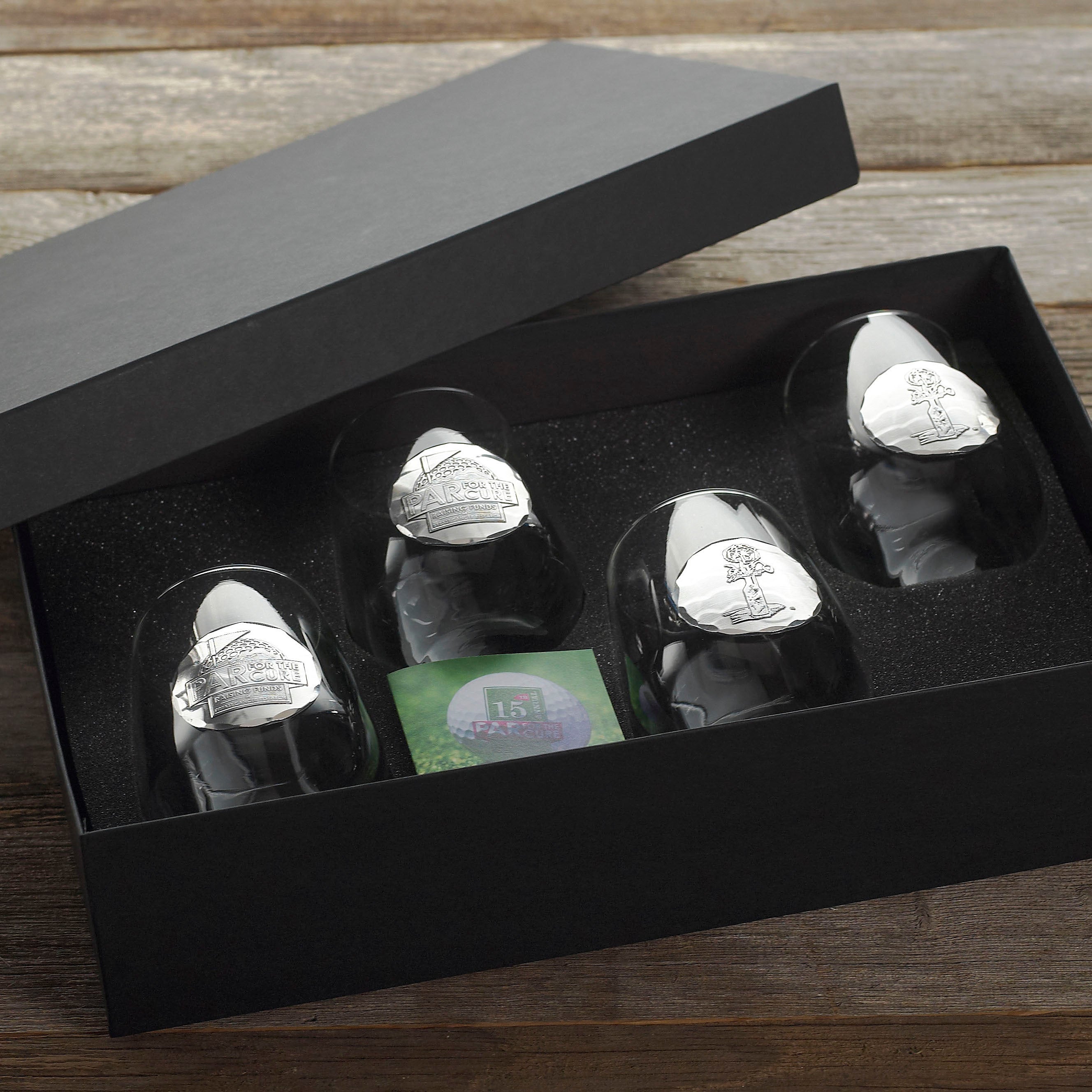 Wine and dine your entire audience with these custom stemless wine glasses! This set comes with two 15.25 ounce glasses that feature a hand hammered medallion that can beautifully showcase your logo or artwork. They come perfectly packaged in a 2-piece presentation box.  Perfect for gifting.  It's a great idea for corporate events, wedding favors, wine tastings, vineyard promotions and even celebrating important milestones and recognizing donors. There is always a reason to say "cheers" when these glasses are around!