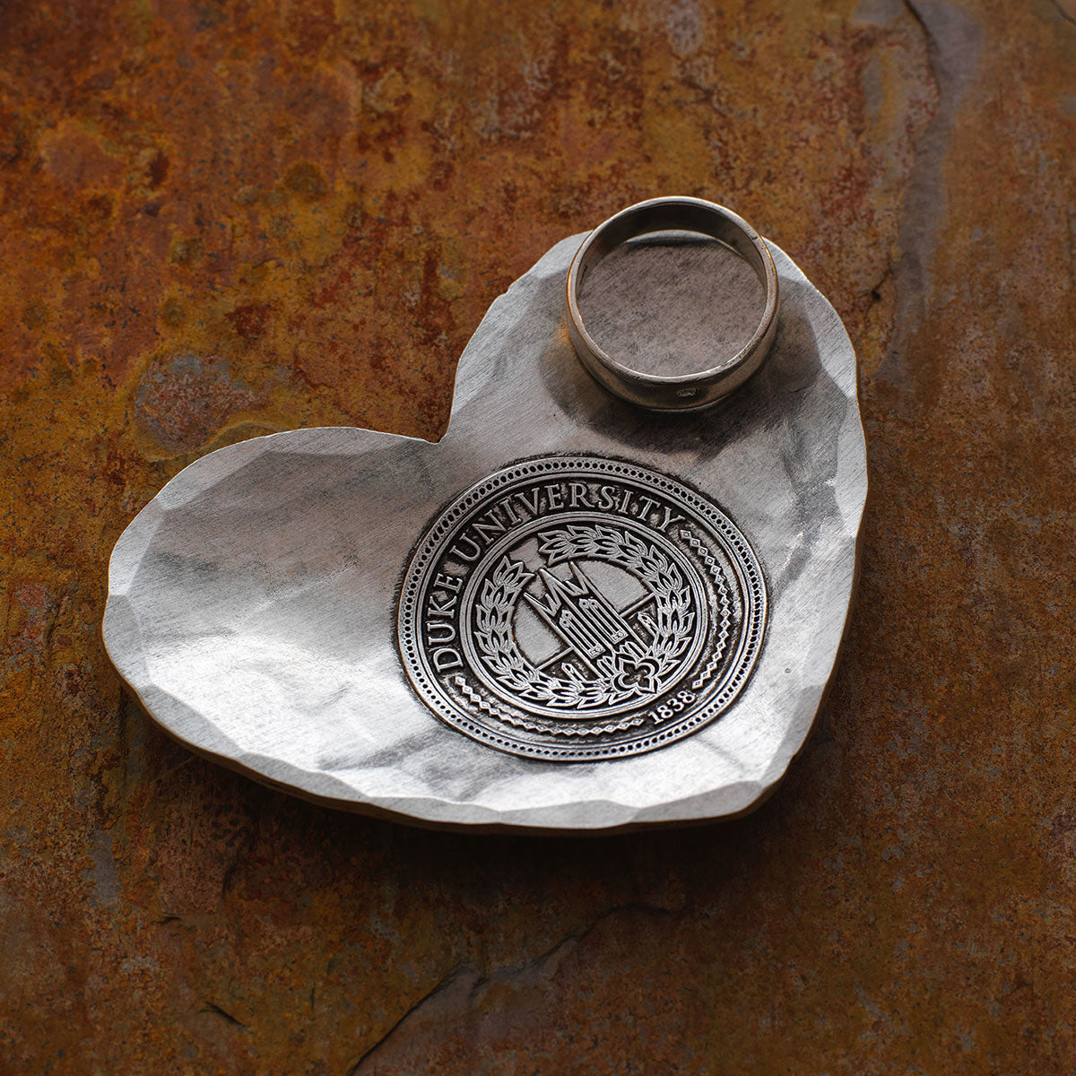 Make a big impression in a small space with this functional heart dish! Measuring 2.75" x 3.75" it comes in aluminum and bronze. A great mailable gift, it is perfect for in room drops and for employee and customer appreciation. It's handcrafted in the USA and a detailed impression of your artwork is hand hammered right into the metal. Leave it next to your bed, on your dresser, or anywhere you place your rings or air pods.