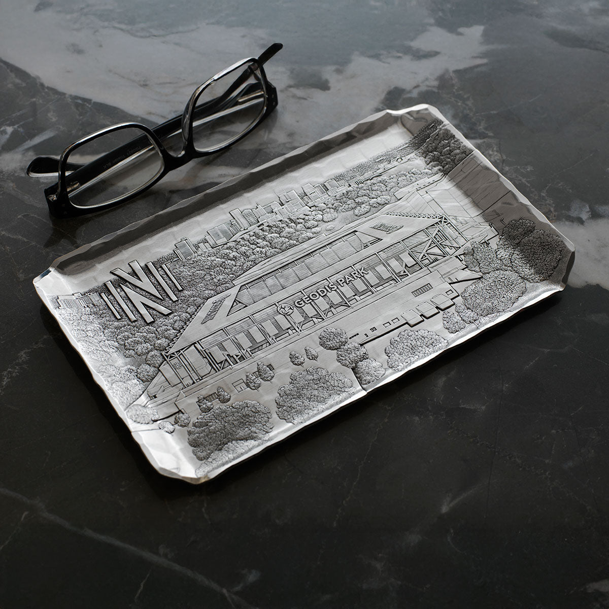 Serve up a gift that will be talked about for years! Your personal butler, this tray is hammered in aluminum or bronze and made in America and is perfect for serving cocktails or holding personal items. With a large space to customize, this attractive metal tray makes a fitting tribute to a once-in-a-lifetime achievement, historic moment or treasured memory. Your custom design works great on this piece, as well as buildings, landscapes and other scenes. When you want a gift that makes a lasting impression, look no further than a commemorative metal tray that lasts a lifetime.