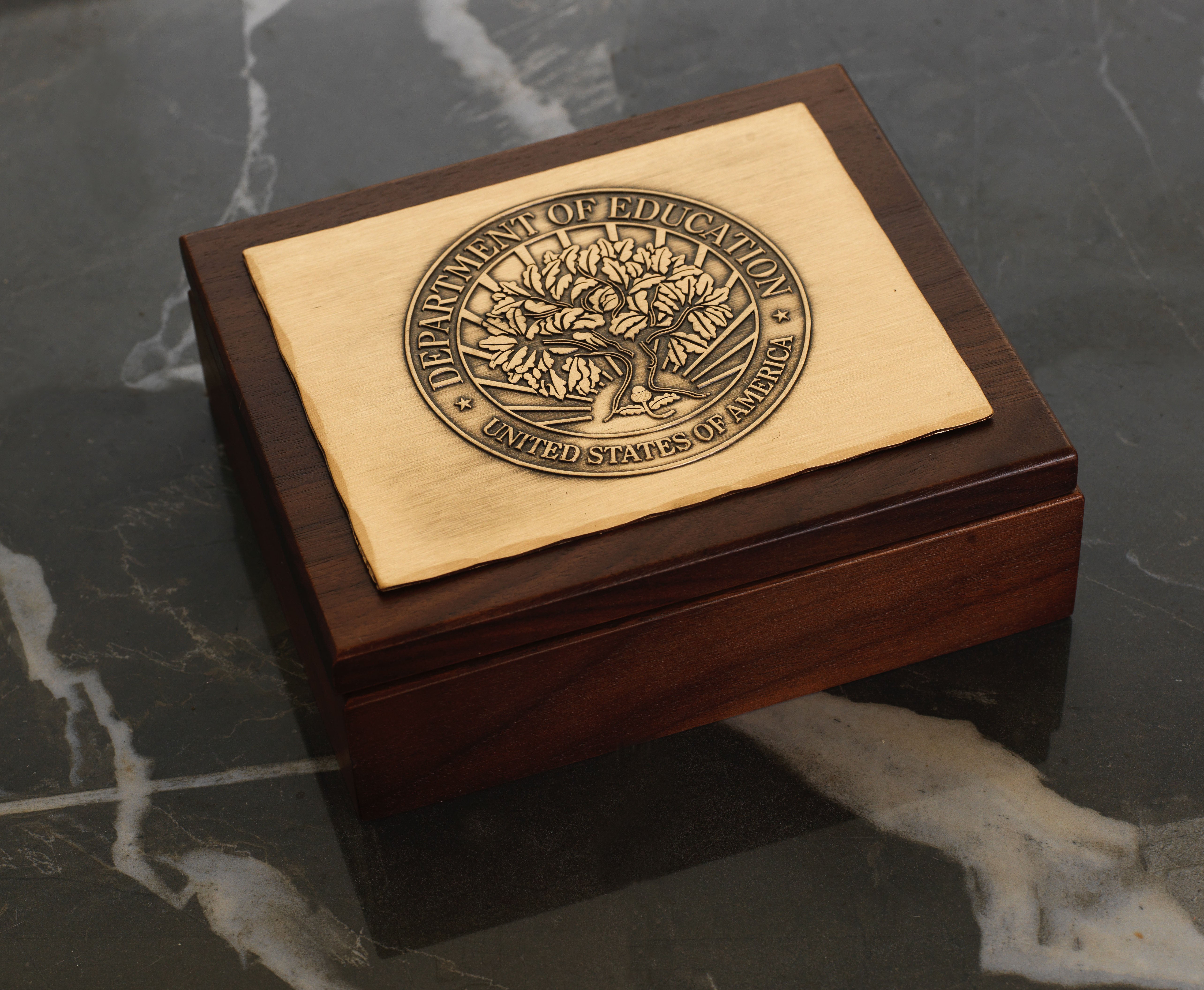 Polished wood meets hand-forged metal in this classic, customizable keepsake box. It measures 5" x 6" and is expertly handcrafted in the USA. The metal plate on the lid is offered in aluminum, bronze or copper and can be customized with a brand name, logo or any other message that you want to display. This beautiful box is ideal for corporate giveaways, holiday gifts, recognition ceremonies and more! Say "congratulations" in a very special way!